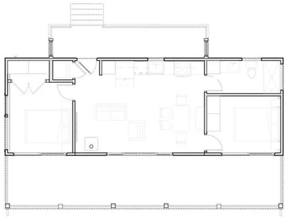 The Wren is a one story modern cabin with 2 bedrooms and 2 and a half baths. This design features an elongated living area with extra room for a full dining table. You will love the wall of windows facing your mountain view, which open up to the large porch.